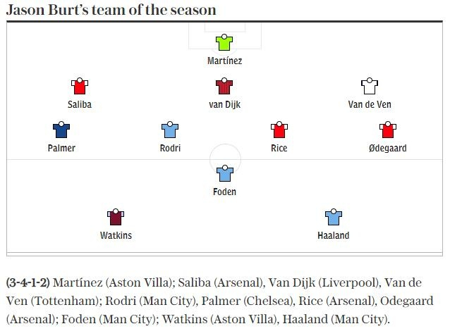 23-24赛季英超抵制,英媒《电讯报》记者Jason Burt评比出本赛季最好威望,曼城阿森纳各3东谈主入选,帕尔默、范迪克等球员在列。