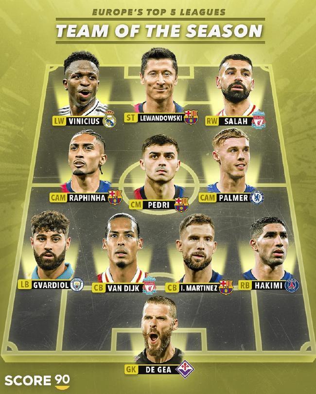 后卫:格瓦迪奥尔(曼城)、范戴克(利物浦)、伊尼戈-马丁内斯(巴塞罗那)、阿什拉夫(巴黎圣日耳曼)